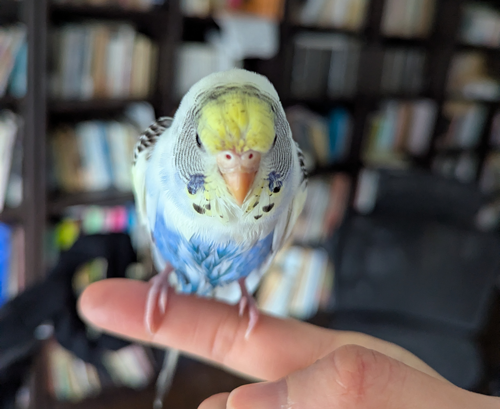 お迎えした頃はあまりはっきりしていなかった頭の黄色がくっきり濃くなって、青いお腹とのコントラストが美しい子に成長しました。
